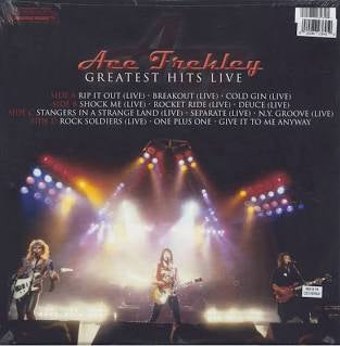 Double vinyl LP pressing. Greatest Hits Live is a live album by Ace Frehley. The album contains ten live tracks and two studio recordings. Tracks 1-6, 8 and 10 were recorded in London, England. Tracks 7 and 9 were recorded in Chicago, Illinois. The final two studio recordings were outtakes from Frehley's previous greatest hits compilation, Loaded Deck.