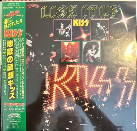 KISS Lick It Up (Rare 1983 Japanese 10th Anniversary issue 10-track LP, a superb & complete package! The picture sleeve is covered with a full LP sized obi/lyric insert, designed to keep fans from seeing the band without make-up until they'd purchased the album! This copy is in wonderful near mint condition 28S-181). It is NOT the reissue from KissOnline.