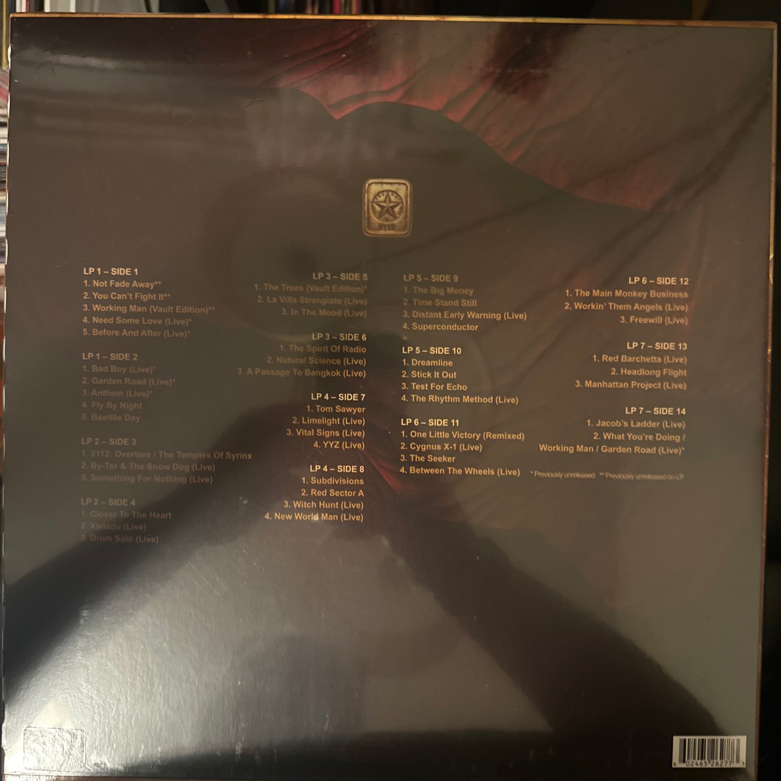 Celebrate 50 years of RUSH with their first-ever complete career anthology. 50 tracks on 7 180g LPs featuring selections from every studio, live and deluxe reissue album. Igniting the experience are the very first two singles “Not Fade Away” and “You Can’t Fight It” remastered & reissued for the first time ever. The collection showcases 7 unreleased tracks including five 1974 live selections with the non-album songs “Bad Boy” and “Garden Road,” a Vault Edition of “The Trees” with an alternate guitar solo, and the very last performance with Neil Peart in Los Angeles on August 1, 2015 of “What You’re Doing / Working Man / Garden Road.” The 104-page hardcover book features new Hugh Syme 50th anniversary artwork along with stunning new song illustrations, photos and liner notes by renowned rock journalists David Fricke and Philip Wilding.
