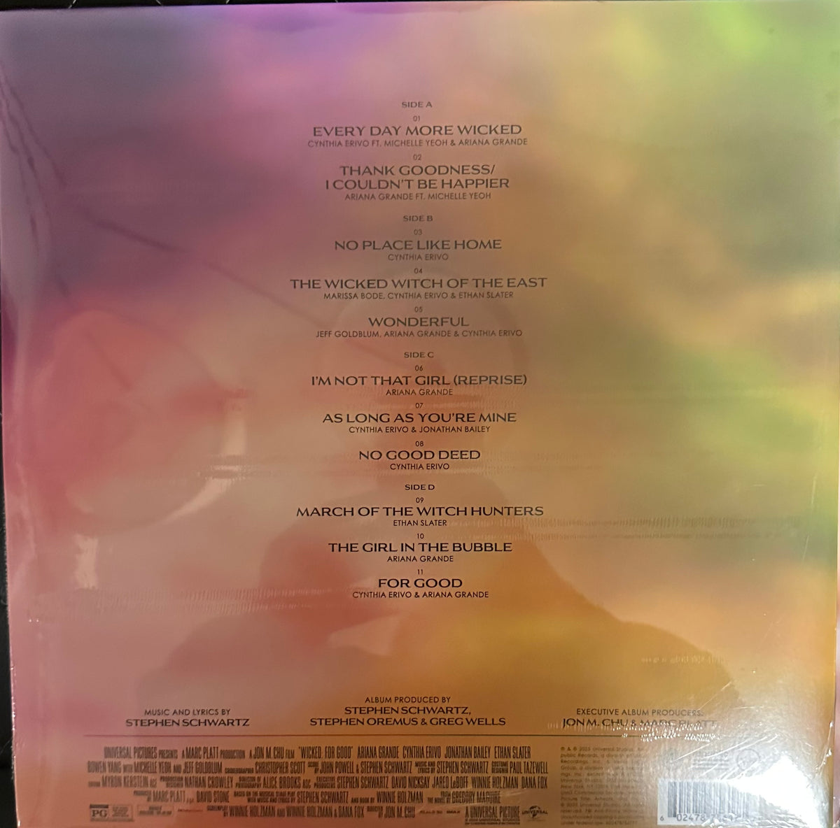 Wicked: For Good - The Soundtrack features performances by the stars of the electrifying conclusion to Universal Pictures' global cinematic Wicked sensation, Wicked: For Good. With music and lyrics by legendary Grammy and Oscarr winning composer and lyricist Stephen Schwartz, the soundtrack includes two new original songs featured in the film: "No Place Like Home" performed by 3x Academy Awardr nominee, Grammy-winning Cynthia Erivo as Elphaba, and "The Girl In The Bubble" performed by Academy Awardr nominee, Grammy-winning Ariana Grande as Glinda. In addition, "The Wicked Witch of the East" is exclusively featured on the film soundtrack, as it was not previously released as part of the Original Broadway Cast Recording. The soundtrack also features fan-favorites "Thank Goodness," "As Long As You're Mine," "No Good Deed," and the title track "For Good." Wicked: For Good arrives in theaters November 21, 2025.